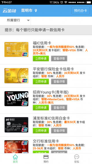 云金融信用卡助手手机客户端免费为您提供银行信用卡申请办理业务、信用卡管理、信用卡记账服务;包括普卡 金卡 白金卡 大额取现卡 卡通卡面卡 特色主题卡 航空卡超市/商场购物卡 车主卡 网络联名卡 酒店/商旅卡 女人卡 标准卡 慈善/环保卡等信用卡的搜索比较服务,帮助您迅速找到合适的信用卡,免费线上申请,