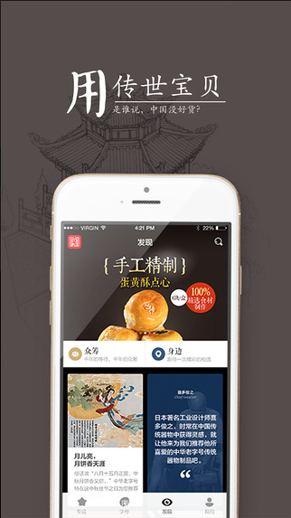 《老字号》是一个为老字号企业推出的移动平台,在这里你能发现各种各样经得起历史淬炼的老字号物事,如小吃、饰件、衣物等等。