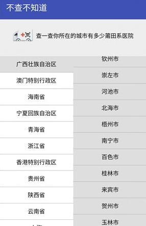 大家平时见过的一些医院的广告大体都是什么玛丽妇产医院、男性疾病医院之类的,其实真正的三甲医院根本不用打广告,做广告的都是那些害人的莆田系医院。这里给大家提供了莆田系医院名单查询系统,这款软件可以帮你查询自己所在的城市有多少莆田系医院,你可以查询到医院的具体名称,珍惜生命,远离莆田系!