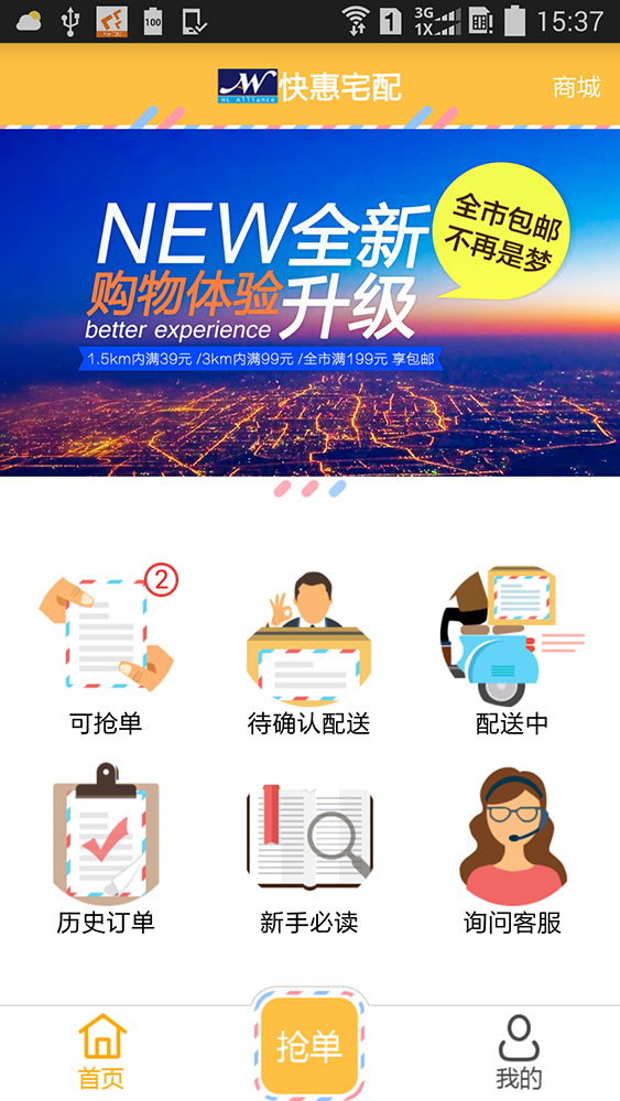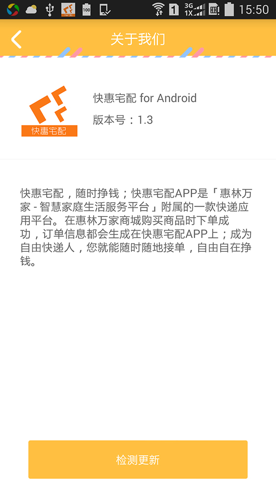快惠宅配,随时挣钱;快惠宅配APP是「惠林万家-智慧家庭生活服务平台」附属的一款快递应用平台.在惠林万家商城购买商品时下单成功,订单信息都会生成在快惠宅配APP上;成为自由快递人,您就能随时随地接单,自由自在挣钱.