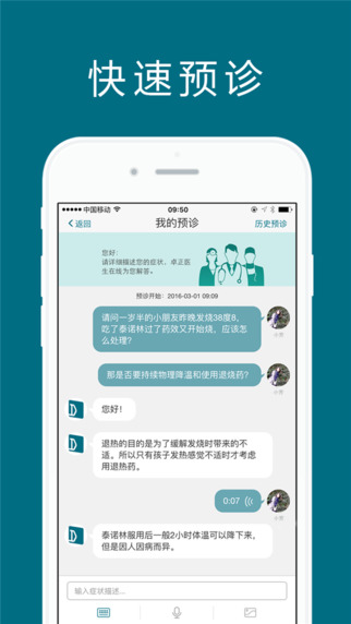 2、专业高效的快速预诊:通过在线发送图文、语音描述您或家人的疾病状况,卓正专业的医护团队将会快速反应,为您提供专业的医疗咨询建议,向虚假的医疗信息say no,为您及家人的健康保驾护航。