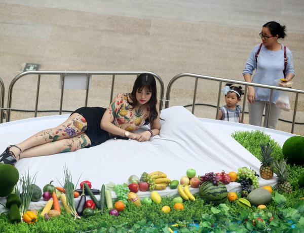 4月30日,广东东莞一商场,十多家餐饮品牌联手推出8个品种,各种美食和人体彩绘模特摆放在一个5米的超大型青花瓷巨碗上,给市民们带来近距离的视觉和味觉上的大餐。