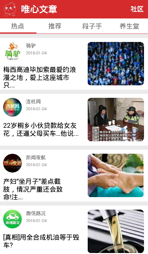 1、唯心文章,聚合各大“微信公众号文章”,涵盖:热点、新闻、段子手、八卦精、财经迷、汽车迷、科技咖、潮人帮、 辣妈帮、点赞党、旅行家、美食家、体育迷;