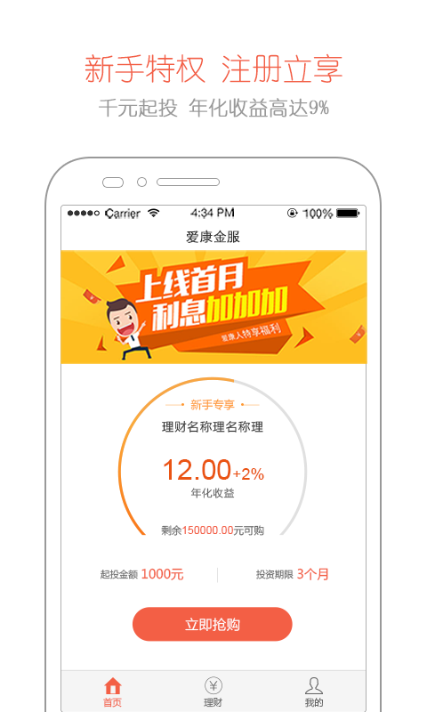 【新手专享】新用户注册后可购买新手专享理财产品,年化收益率高达9%,仅限首笔投资。