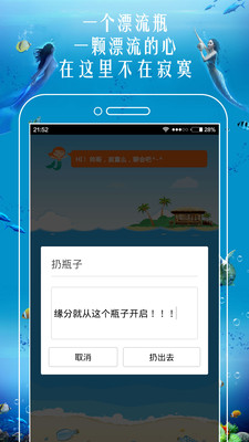 当你一个人过周末需要有人陪时;当你想唱歌,却找不到人时;当你晚上回家,想有个人请你吃饭时;当你来到陌生的城市,觉得孤单时;当你??就打开恋爱漂流瓶!我们不自诩XX年度火爆交友软件;也不吹嘘用户超过几千万。