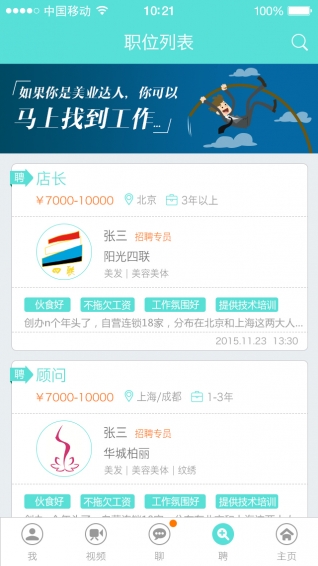 美业直聘满足各类美业人士的招工和找工作的需求。