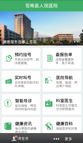 “掌上苍医”苍南县人民医院对患者服务的深入挖掘,从诊前、诊中、诊后多流程简化就医流程,提升就医体验。目前已实现手机挂号、取报告单、智能导诊、科室医生、医院导航、健康资讯、健康百科等功能。