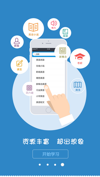 小e英语app精选英语听力、英语口语、英语阅读、英语演讲、英文小说、英文应用写作(英文简历、商务英语、英语对话等)、英语四级六级、英语单词语法、中小学少儿英语等十几个主题的免费学习资源,旨在为广大在职英语学习爱好者提供优质学习资料。