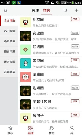 用户可以通过关注职场圈、朋友圈、商业圈、亲戚圈等不同话题圈子来学习不同场合下的谈话技巧,