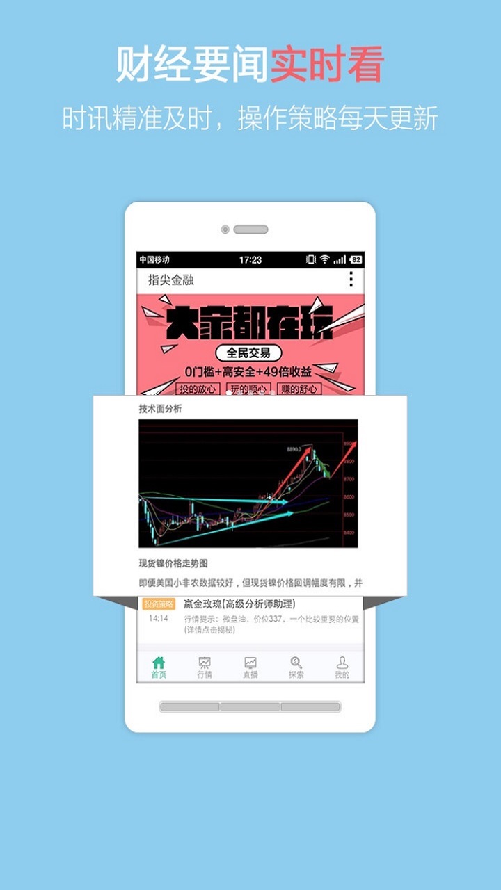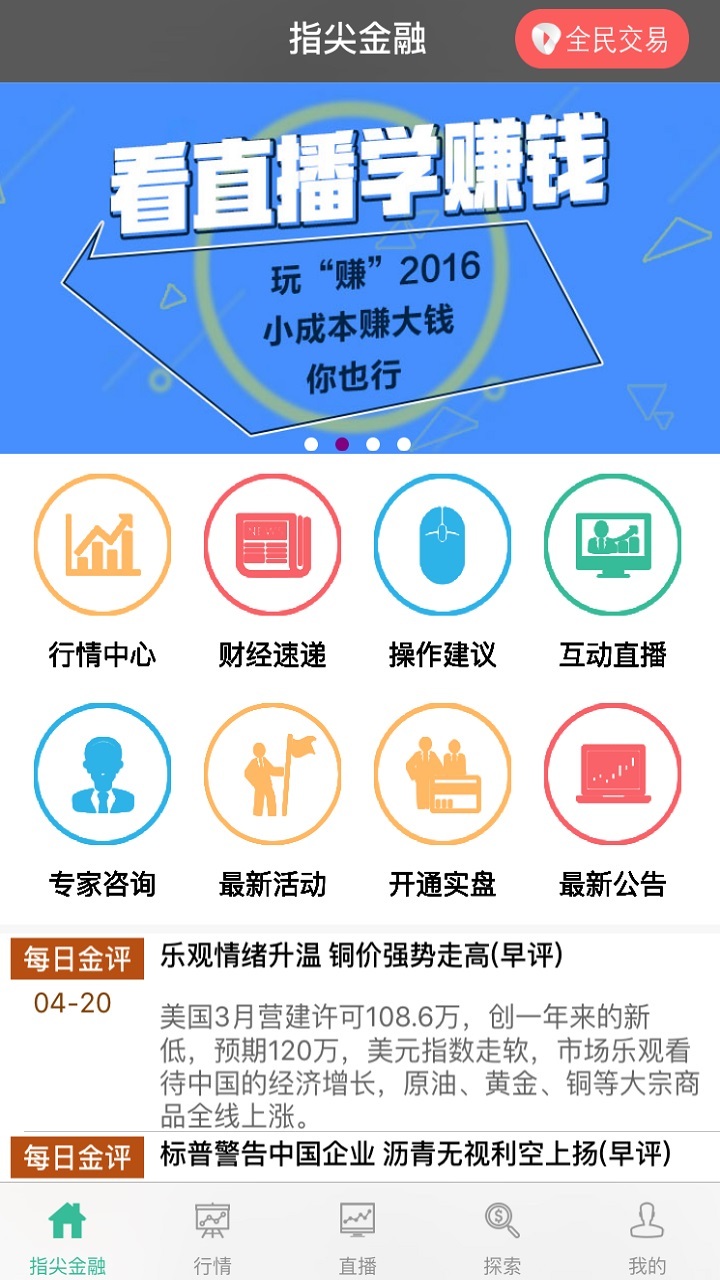 1、财经要闻实时看,时讯精确即时,操作策略每天更新; 2、现货行情随时看,数据+K线,查看行情更直观; 3、专家直播24小时在线,专家指导,实战操盘策略; 4、福利优惠等着您,大奖送不停; 5、在线客服