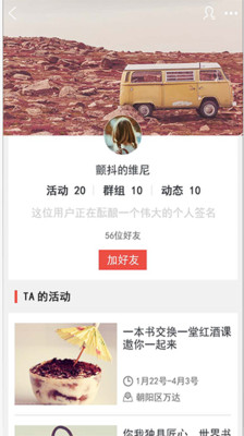 您还可以邀请您的好友共同加入您发起的主题活动,与您一同共享休闲时光,在紧张的生活节奏下共同放空自己,让网络时代忙碌的我们回归真实世界的社交生活。