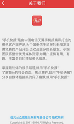 手机快报”是由中国电信天翼手机报精彩打造的资讯客户端产品,为中国电信手机报的老朋友提供的产品升级,也欢迎更多的新朋友。小编团队将整合丰富的媒体资源,为用户提供有用、有趣、丰富多彩的精品资讯信息。