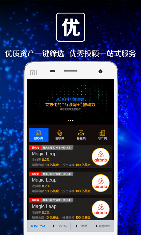 3,通过App项目约见、会议安排、私人定制等功能可高效对接资金资产双方需求,带来卓越的智能一站式体验。