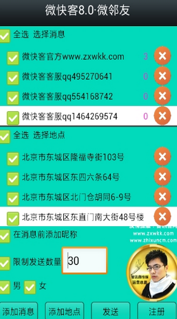 微快客免费破解版是一款微商神器,这款软件可以帮助你做好你的微信营销,手动定位到任何位置,自动向附近人打招呼,添加好友,让你从此不再愁客源,也许你与微商的成功只差一个微快客的距离,赶快来下载吧!