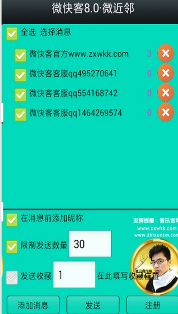 微快客免费版app是一款帮助微商朋友更好的进行营销的手机应用软件,在该应用中能够帮助用户自动搜索人脉,微信自动加人。自动循环群聊群发消息,给微商的朋友减轻不少的麻烦,避免自己重复手动发送消息。正在从事微商的朋友们,赶紧来飞翔下载使用吧!