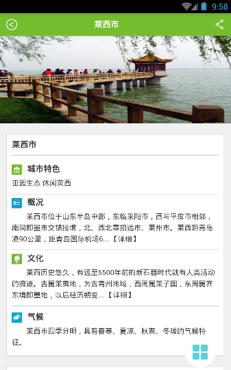 莱西旅游app是一款由莱西县旅游局官方打造的一款应用软件,本应用涵盖了当地的旅游资讯,及旅游动态信息于一体的信息平台,游客可根据客户端进行查看目的地信息及当地要素信息即吃、住、行、游、购、娱等详细旅游信息。