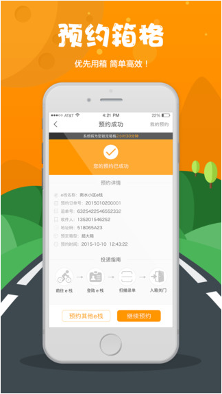 【预约箱格】:手机端提前录单,免费预约箱格,优先用箱,省时更省心;
