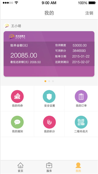 3、“我的” 我的账单、我的码券、密码设置、我的通知、我的积分、我的名片等个人信息,让您一目了然。