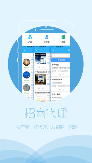 进入首页“代理商”,可直接按地区、医院、优势科室等属性筛选合适的代理商,并添加为好友,即时沟通交流,精准对接业务;同时,可以在“我的招商产品”中免费发布产品,完善产品招商信息,有需求的代理商会搜索浏览到产品。