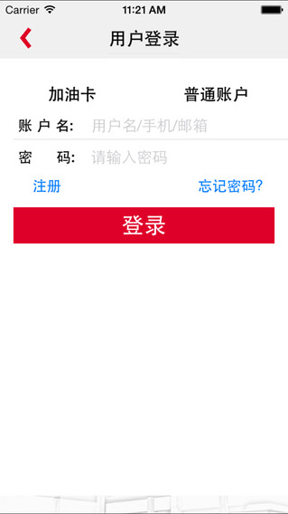(1)在"余额查询"或"充值记录查询"页面,点击圆形带"+"按钮,可显示"添加加油账户"页面;