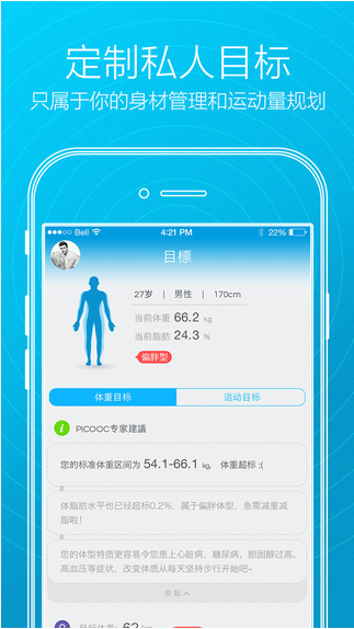 最智能、最好用的身体指标监测和每日运动量管理App!有品·PICOOC app配合有品智能体脂秤使用,可即刻同步体重、脂肪率、内脏脂肪指数等9项重要体征指标,评测分析身体状态,并基于评测报告量身打造专属动态健身目标,帮助您明确方向,每天更接近理想的自己。亦可单独使用,可追踪和分析您的体重、体围等塑形关键指标,并根据身体状态制定最合理的每日步行目标,自动记录步行情况,及时提供反馈报告
