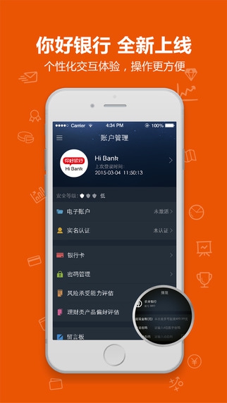 你好银行iOS版是南京银行专为使用iPhone手机的客户推出的一款移动理财app,app内的产品精挑细选收益更高,页面简单大方,账户安全有保障,我们配备专业的理财团队和互联网专家队伍为您的资产保值增值提供最佳的理财方案。