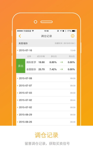● 收藏并跟踪买卖信号:打开组合看清组合内牛股之后,点击页面左下方的“收藏”。从这一刻起,一旦组合有调仓变动都会实时推送给您。点击组合页面中下方的“调仓记录”,各个股票的什么时候买、什么时候卖等信息一目了然。这是金贝塔的绝对亮点,所有仓位公开透明,调仓指令实时提醒。新调入的股票代表“买入”,而调出的股票也就代表“卖出”。
