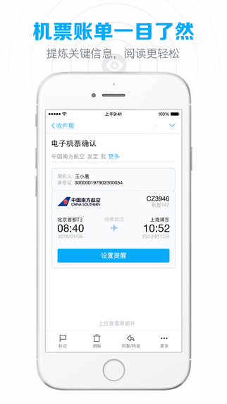 - 机票、酒店和账单邮件卡片式设计,重要信息一目了然。