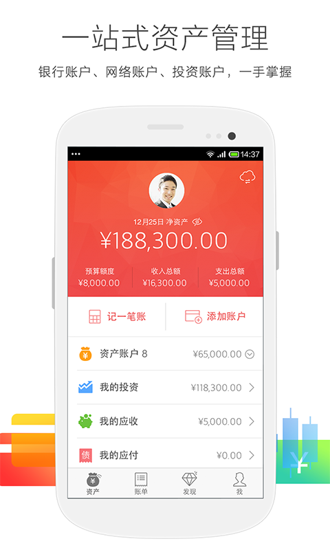 借记卡,信用卡账单可实时自动同步股票、基金对接交易行情,最新现值随时跟踪P2P等互联网理财项收益天天更新应收应付项目贴心到期提醒。