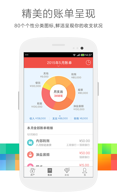 最养眼的统计图表,随账单流水实时更新完全可自定义的记账分类80+个性化精美图标供你选择,鲜活呈现收支状况有钱·感觉真好!