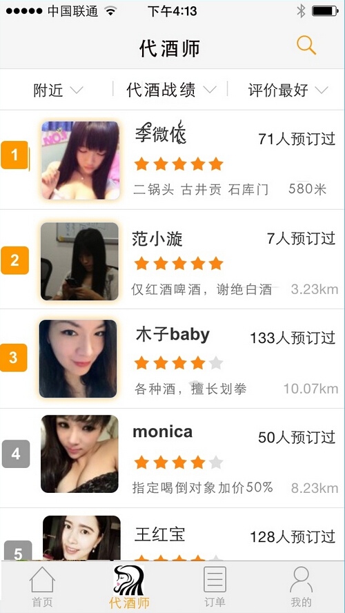 4、用户则可以通过看该美女的酒量介绍、酒令水平、照片来进行选择。年终尾牙大家喝酒,喝酒必然拼酒、斗酒,喝完红酒喝白酒,喝完白酒喝黄酒,喝完黄酒喝洋酒,你敬我我敬你几轮下来,眼看自己不行了对方却越战越嗨,喝倒事小、丢面子事大,如是急忙投出手机,打开滴滴代喝APP,按相貌、酒量、战绩、价格挑选一个美女代喝师,滴滴一下,替你代喝。