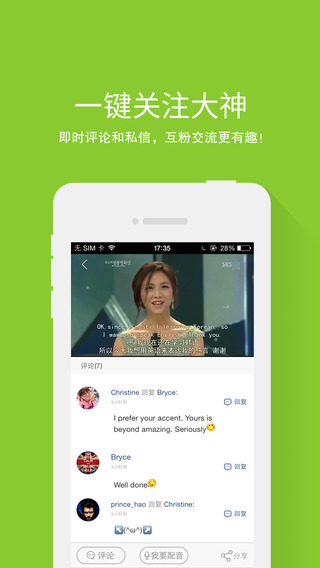 3.全新方式:摆脱枯燥的传统学习方式,走进轻松又好玩的配音学习社区,跟随我们的精选推送,通过配音来学习英语、提高口语。早晚练一篇,口语屌炸天!