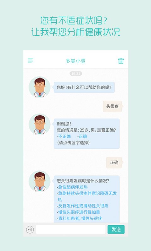 「大白」是一个遥不可及的幻想,但拥有一位贴心的私人健康顾问却不难。「多美小壹」就是一只专注于解答健康问题的聊天「机器人」。你只需要将你的症状告诉小壹,他就会立刻开启「诊断」模式。在对话中不断对个人信息及病症进行完善,最终「确诊」。小壹会清楚地告诉你疾病的起因、病症以及防治措施。你还可以跳转到壹健康预约医生或是与病友交流。