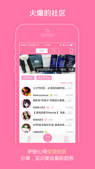 6、 市面最火的美妆论坛“闺蜜晚九点”重磅推出,支持发帖、收藏、回帖、插入图片产品等相关功能,在这里和蜜友们玩转美妆和健康