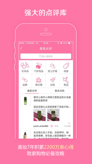 1、 360度无死角查看产品口碑,通过产品分类、功效、排行榜、品牌、肤质、年龄、点评质量等多维度查询口碑心得。