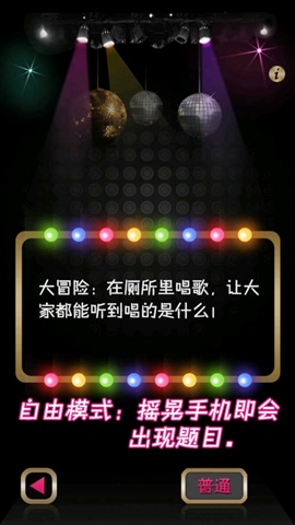 提供三种游戏方式:自由模式(摇晃手机即可出现题目,适合轮流游戏,每个人都有机会)、随机模式(通过拍照记录每个玩家的头像,游戏开始后会随机抽取那个倒霉的玩家来做题)、击鼓传花模式(使用传统的击鼓传花方式游戏,游戏会模拟逼真的击鼓声,并随机在一刻停止,然后看看传递的那个东西留在哪个倒霉蛋手中呢:))