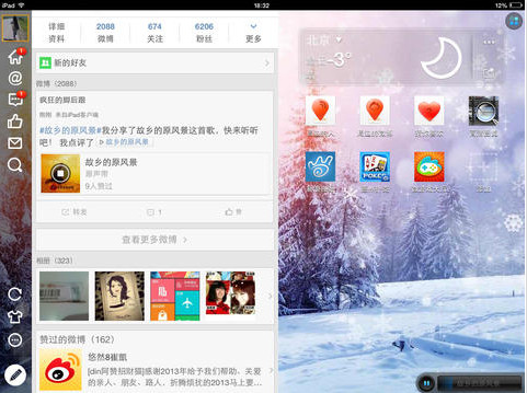 具有和电脑客户端媲美的功能,而且还可以随走随拍随传哦!并且针对ipad大屏幕设计的全新触控体验,方便您的应用!享受 iPad 独有的大屏触控体验,集阅读、发布、评论、转发、私信、关注等主要功能为一体,随时随地同朋友分享身边的新鲜事。