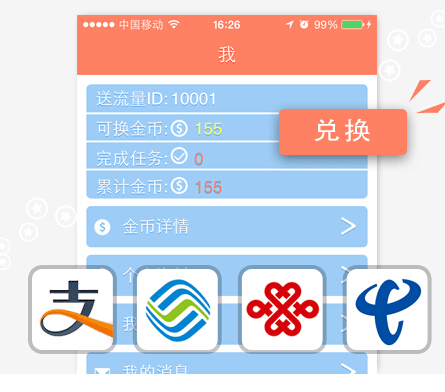 “送流量”是纳财网络与移动、联通、电信三大运营商合作而研发的一款免费领取流量包的利器,以“你的流量,我买单”为目标,使得玩家们可在有WIFI的情况下完成“送流量”内的任务,获得一定积分,再以积分换取电信、移动2G\3G\4G、联通2G\3G等流量包。“送流量”能让你无顾忌的网上冲浪,不用担心话费的超标,妈妈再也不用担心我的流量超标啦!