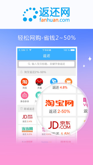 返还网-官方客户端,是手机端网购返利最受欢迎的一站式软件。千万级活跃用户热荐,淘宝、京东、美团、携程等重点合作伙伴,随时随地享受网购返现优惠!