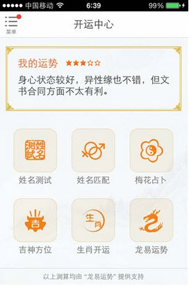 天气准确、更新快、含PM2.5及天气预警、覆盖城市广。 黄历专业、解释详尽,参考大量古典书籍,结合八字、周易、紫微斗数、奇门遁甲等命理元素,借由现代科学算法进行测算。测算结果精准、简单明了、易懂。为您的事业、爱情、运势、风水提供解惑和指导帮助。