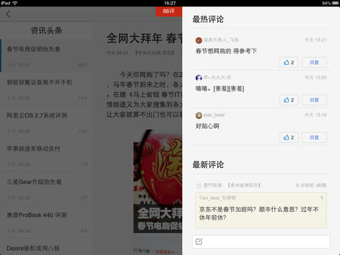 【更多贴心功能】分类菜单栏手势滑动、产品点评回应、分享微博、收藏文章、资讯日历、字体设置