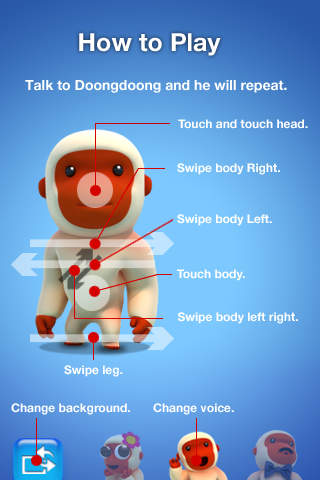 非常有趣的娱乐应用。 最有趣的,神奇和独特的说话的应用程序。 3选择语音语调(男人,女人,Doongdoong) 选择5种不同的背景 Doongdoong可以跳舞像MJ。 如果触摸球按钮,Doongdoong踢球。 如果触摸浇水地面上的按钮即可,Doongdoong sprikle水。
