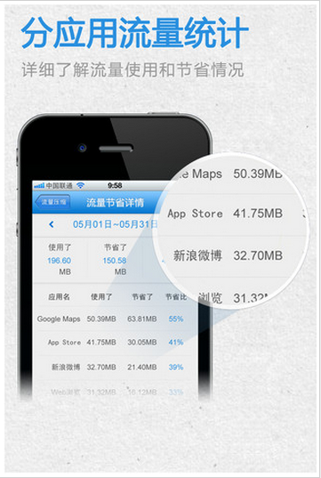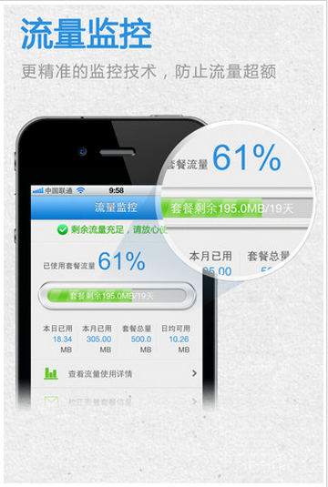 记录了每月应用程序消耗的流量,流量超标会即时提醒,让您不会因流量超标不知而额外付费。