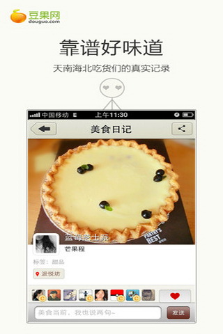 既然美味近在眼前,就别再寻寻觅觅。美食日记,为你发现身边的美食。跟所有与你同样热衷品尝的朋友一起,享受并记录每一个有关食物的幸福瞬间。美食日记不关心餐厅排场是否豪华,优惠力度是否诚实。我们关心的,是餐厅饭菜是否可爱,你的回忆是否甜蜜。看到诱人的日记和餐厅,别吝惜你的喜欢,我们会根据你的口味,知己般地为你推荐餐厅。豆果是全球首家且最大的发现美食、分享美食、交流美食的中文社区。不论居家亲自下厨,还是遍尝天下美味,我们都希望你找到属于自己的美食小幸福。:)