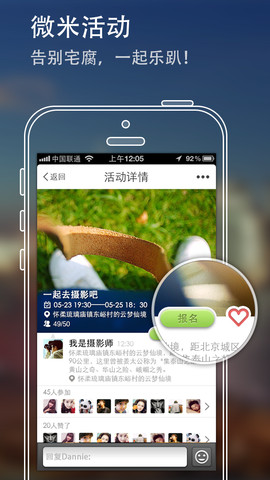 2. 还在用电话短信约聚会?快上微米一键发布活动,时间地点一目了然!别让时间冲淡了哥几个的感情!