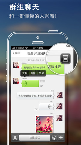 4.群聊:群组公共频道,可建立私聊与小组频道,支持语音、文字、地理位置等信息;