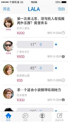 全新社交服务,帮助周围的小伙伴,让啦啦帮你赚钱。 啦啦助你解决生活中遇到的各种问题。 当你需要人陪伴和解决生活中难题时,用啦啦悬赏,让周围小伙伴来帮你。 当你有闲散时间时,你可以通过啦啦,轻松赚取现金悬赏(直接转入支付宝账户)。