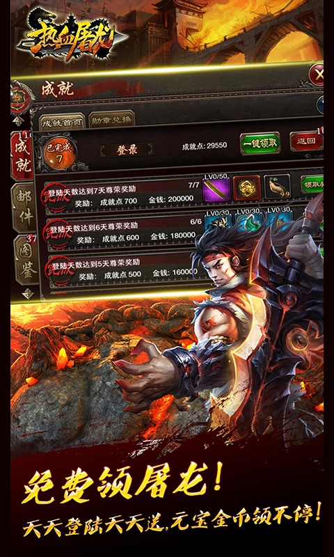 《热血屠龙》是历经1年调查搜集上万名用户建议而打造的传奇类手游,在1.76版本的经典画面、玩法的基础上,针对手机的操作玩法做出了每日任务系统、挂机系统等,上班的时候可以拿经验,坐车的时候可以拿经验,入厕的时候也可以拿经验,完全不担心被别人落下等级。多种多样的地图、副本,即时PK,千人同屏王城战,多样的玩法带你激情2016。
