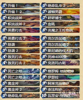 法术中,必备的是升级、英勇打击、致死打击、怒袭、乱斗。升级用来提升武器攻击力和寿命,乱斗解决对手铺场,其他的都是打脸的伤害法术。