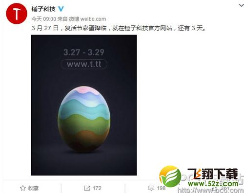 今天,锤子科技在微博上发布了一款神秘的彩蛋新图,并表示在3月27日,复活节彩蛋降临,就在锤子科技官方网站。